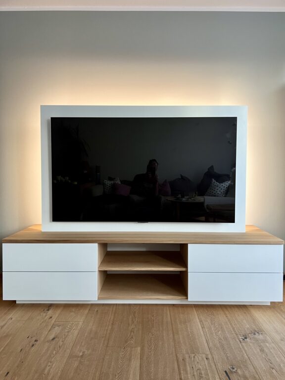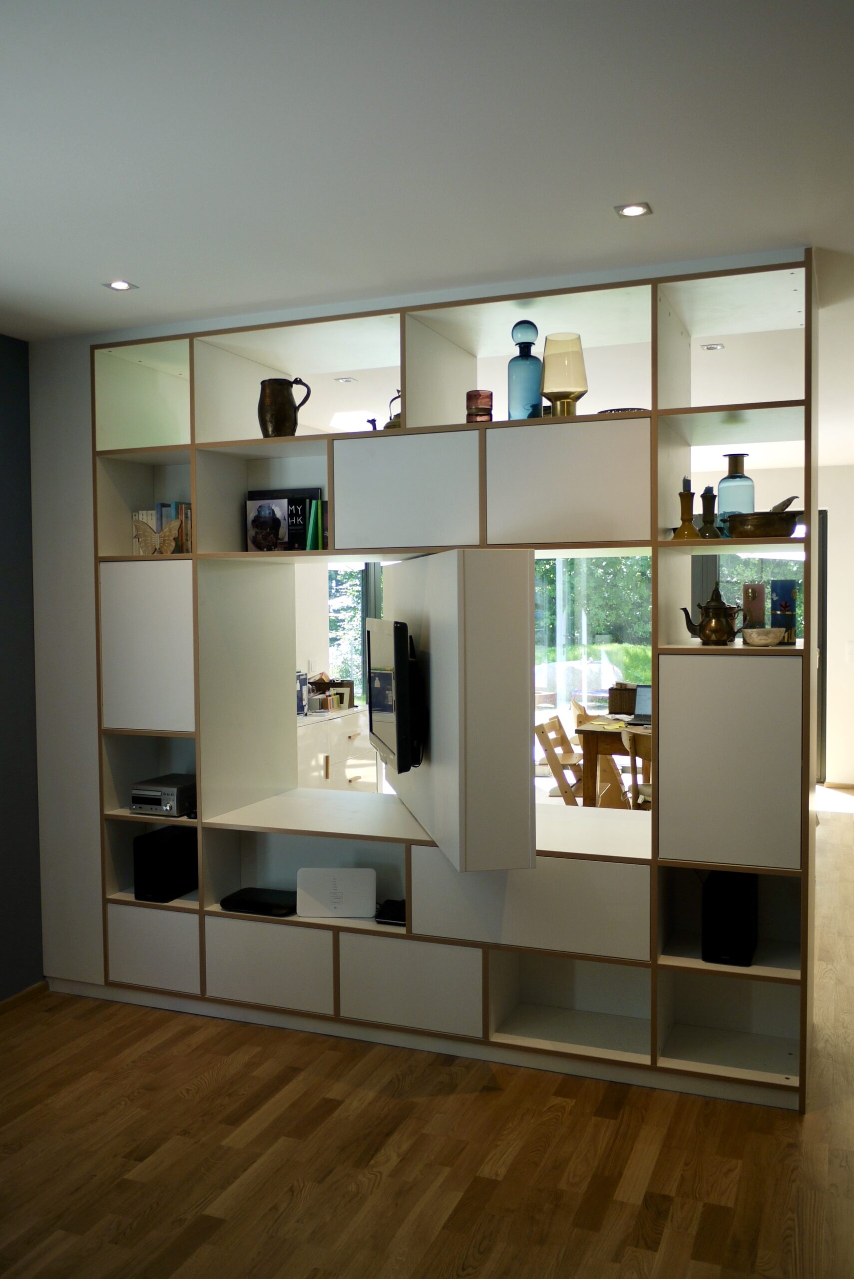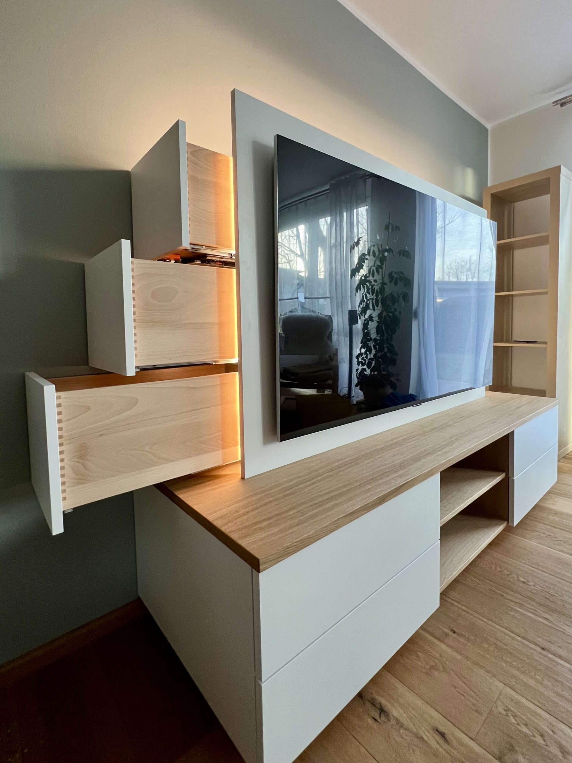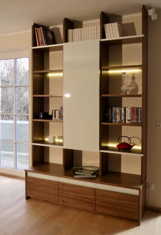 Für den Wohnbereich fertigen wir mit kompletten Wohnwänden optisch ansprechende Regallösungen mit integrierten Hifi- und/oder Home-Entertainment-Komponenten.